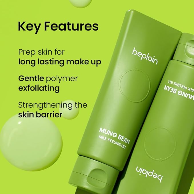 Beplain Mung Bean Milk Peeling Gel offers a smooth, gentle exfoliation using peeling polymers instead of cellulose, making it ideal for sensitive skin. Its formula features Mung Bean Soy Milk to purify and reinforce the skin's moisture barrier, alongside Mung Bean Extract to effectively clear pores and remove makeup residue. This versatile gommage activates instantly on wet or dry skin, dissolving impurities and dead cells with five types of peeling polymers for a comprehensive yet mild exfoliation. For use, massage gently onto skin (avoiding eyes and lips) until impurities clump, then rinse off with warm water. Use externally only; avoid eye contact and discontinue if irritation occurs.