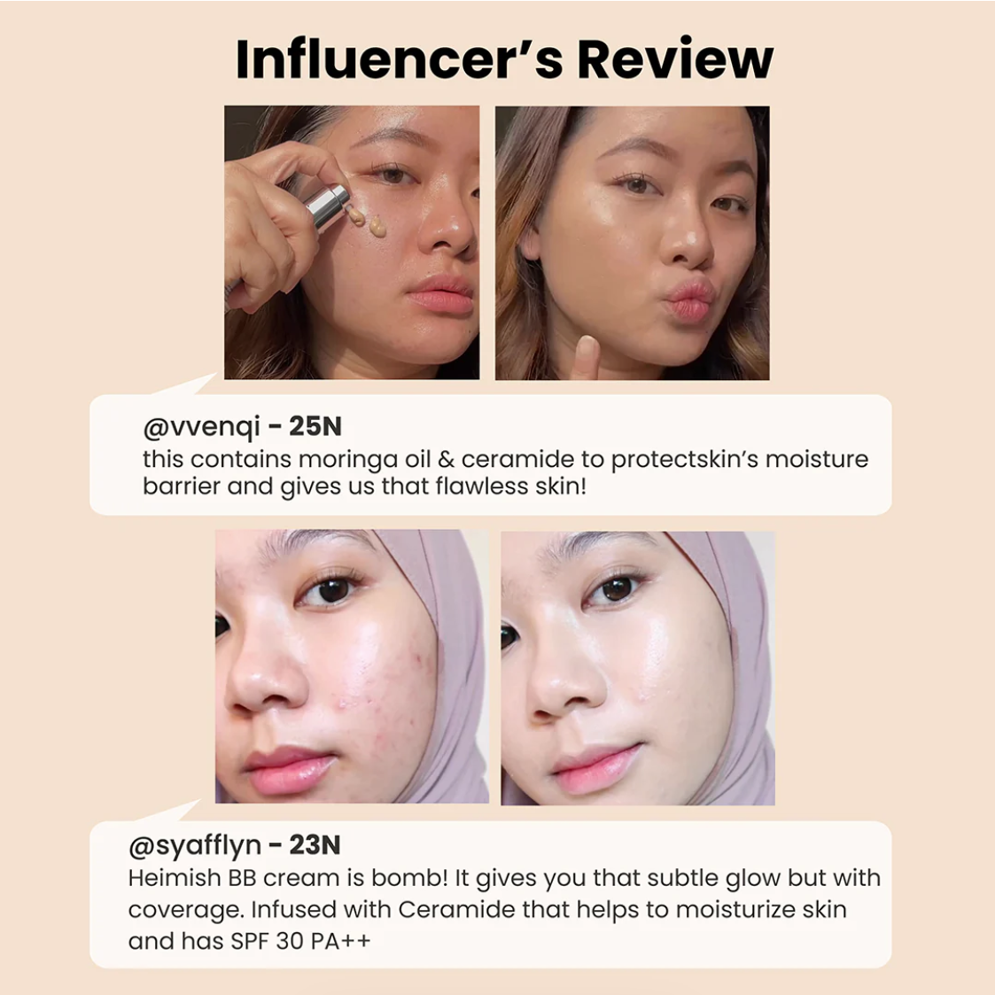 Achieve flawless, radiant skin with Heimish Moringa Ceramide BB Cream SPF30 PA+++. This all-in-one BB cream offers five powerful benefits: intense hydration, superior adherence, buildable, natural coverage, skin brightening, and anti-aging protection. Infused with ceramide for a strong moisture barrier, niacinamide for whitening, and adenosine for wrinkle care, this lightweight formula also provides effective sun protection. It is ideal for a natural, glowing finish.